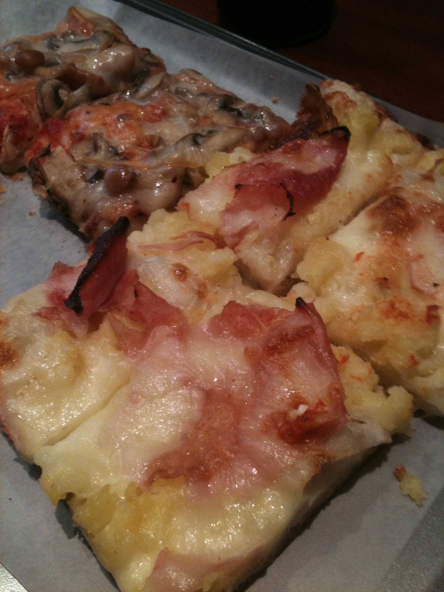 Ciao Roma’s pizza is served by the weight, so you can sample a piece of as many varieties as you wish. Saturday, my boys had the opportunity to try one of Ciao Roma’s latest creations – pizza with tomato sauce, mashed potato, ricotta cheese, parmesan cheese and mozzarella. It was mouth-watering.