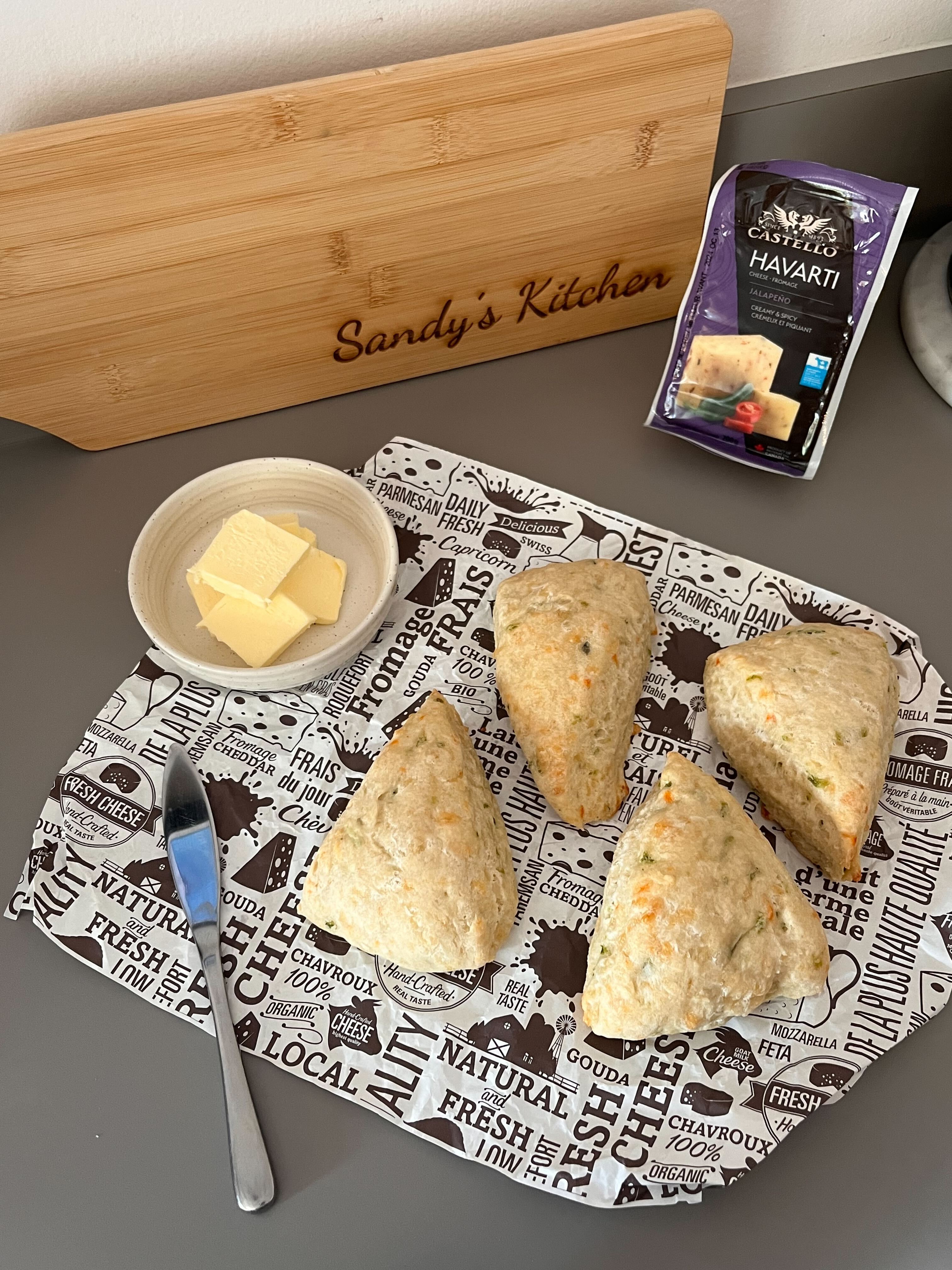 These scones are fluffy on the inside, golden on the outside, and loaded with bold flavour in every bite. The Havarti brings a mellow richness that perfectly balances the kick from fresh jalapeños. Paired with the tang of a sourdough starter, it’s a total flavour bomb.