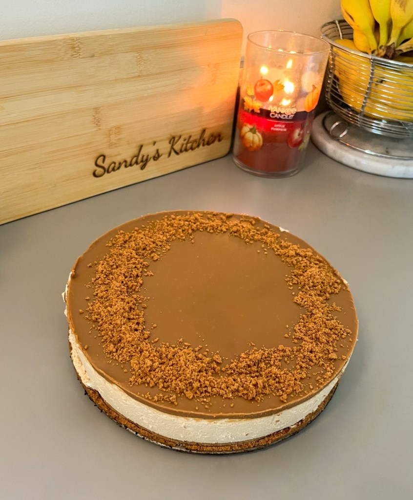 4. Gently melt the remaining Biscoff spread (careful not to get it too hot), pour over the cheesecake, and sprinkle with crushed biscuits.