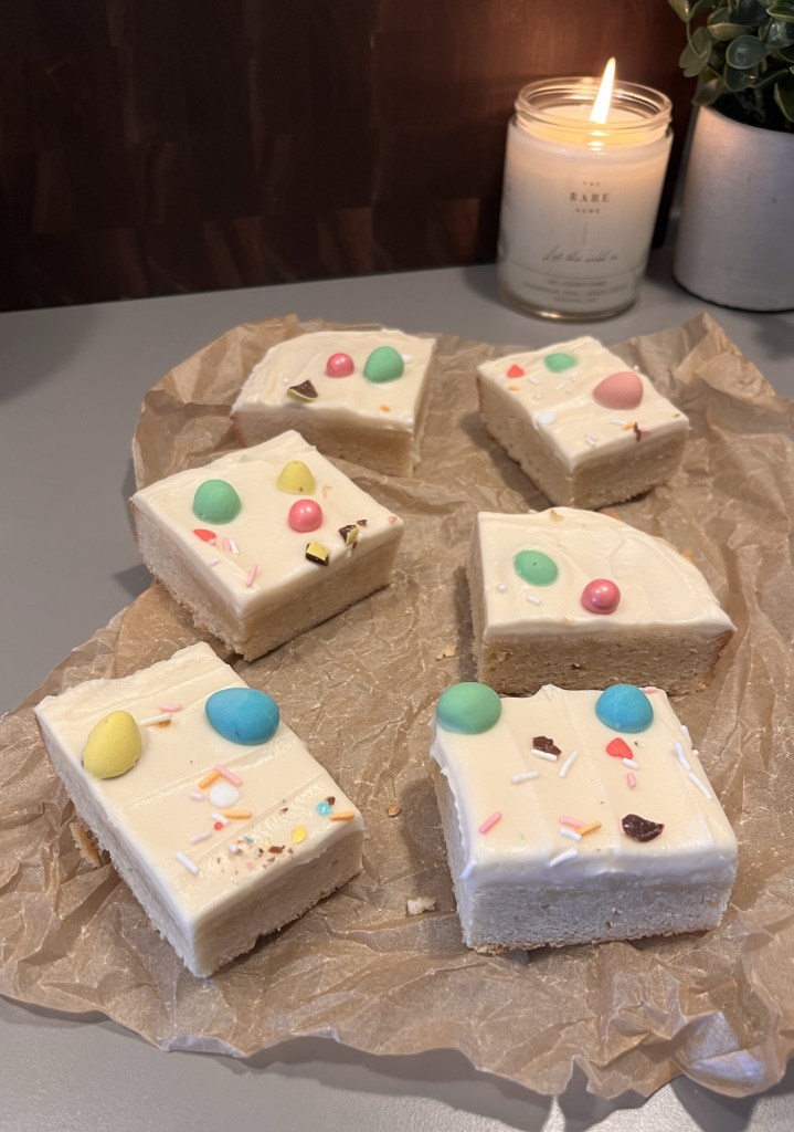 Once cookie bars are cooled, spread the frosting in an even layer over the cooled cookie bars. Sprinkle with your favourite sprinkles, or mini eggs, cut into squares and enjoy!
